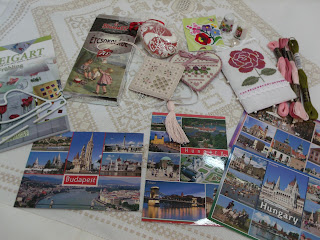 Cartões Postais, linhas, acessórios de bordado, uma revista da marca Zweigart...